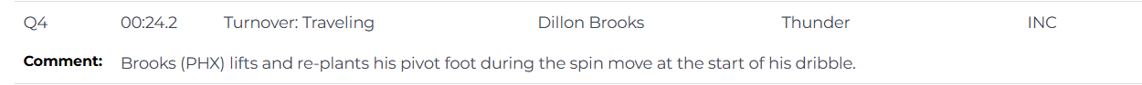 第四节进行到24.2秒时,太阳球员狄龙-布鲁克斯在运球开始的转身动作中,移动了他的中枢脚,应该判罚“走步”。