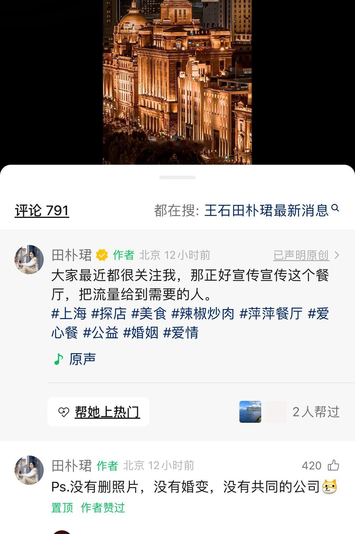 田朴珺:没有删照片,没有婚变,没有共同的公司! 1月5日,田朴珺更新个人社交媒体,在留言区回复网络中的流言,她表示和王石没有婚变。 同时田也用这波流量宣传了上海一家爱心餐厅!真是人美心善。