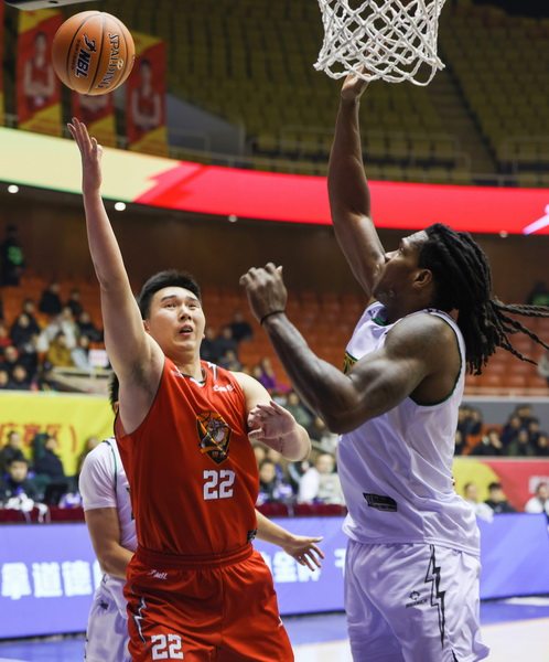 1月4日,石家庄翔蓝队外援5号黑根斯(中)在比赛中。