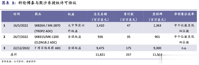 值得注意的是,科伦博泰其实早于大部队2、3年就出海了,是国内第一家将自主研发的ADC授权给跨国大药企的企业。早在2022年5月、7月,科伦就与默沙东达成了SKB264、SKB315两款产品的合作,又于当年12月与默沙东达成七项临床前ADC资产的合作,是迄今为止最大的国内企业生物制药对外许可交易。