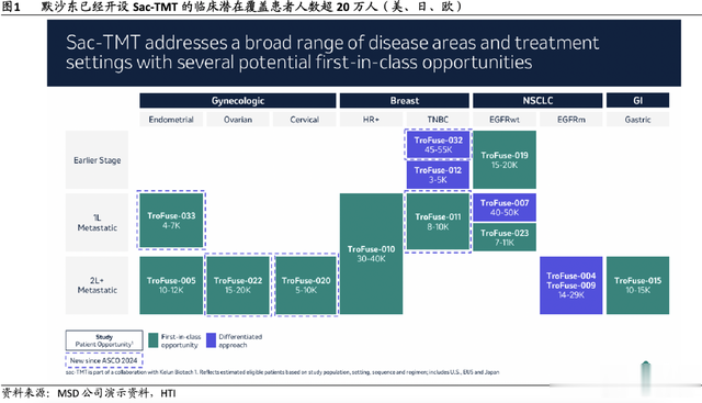 默沙东在海外为Sac-TMT开设14项注册临床,是默沙东当前临床研究的ADC药物中开设临床数量最多的,可见默沙东的重视程度,这14项临床覆盖肺癌、乳腺癌、子宫内膜癌、胃癌、宫颈癌和卵巢癌,潜在覆盖患者人数20~30万人,还出现了首款“PD-1+ADC”的联合疗法。