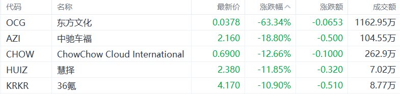 格隆汇1月6日|中概股收盘跌幅居前的个股为:东方文化跌63.34%,中驰车福跌18.8%,ChowChowCloudInternational跌12.66%,慧择跌11.85%,36氪跌10.9%。(格隆汇)
