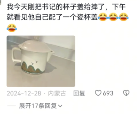 我今天刚把书记的杯子盖给摔了,下午就看见他自己配了一个瓷杯盖