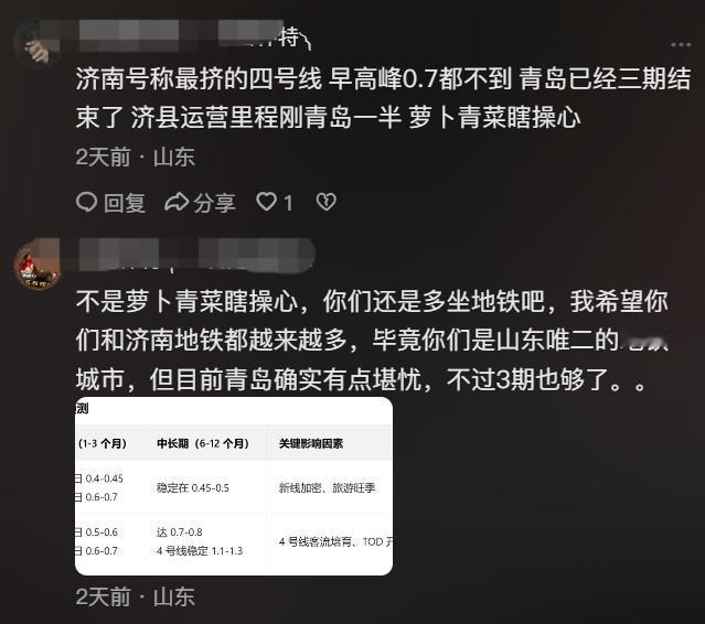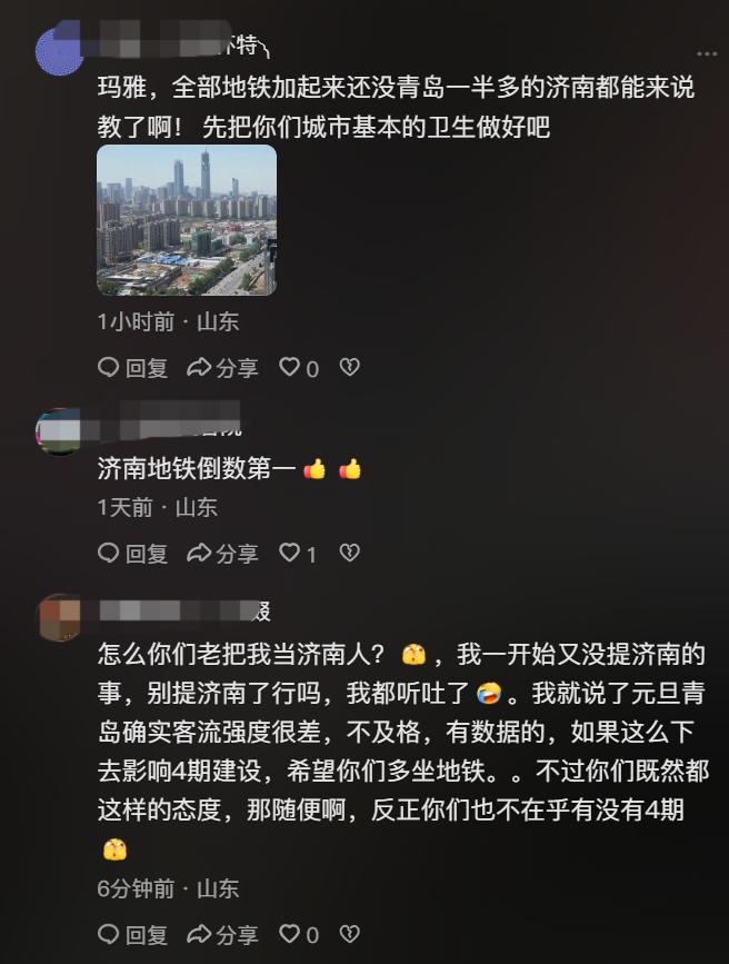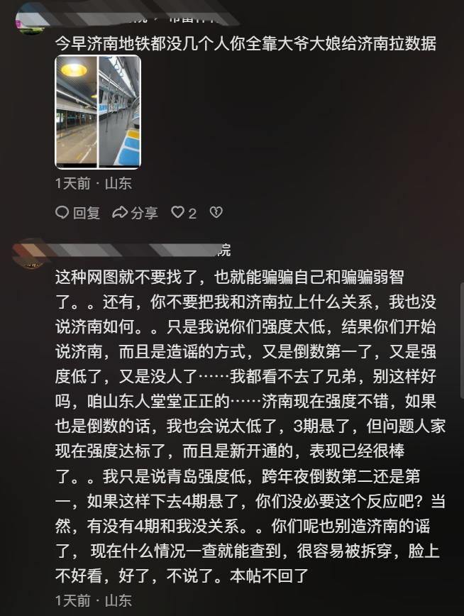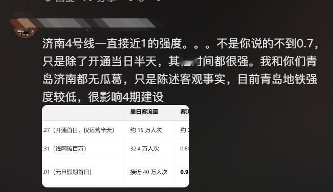 不知道为什么网上青岛和济南的关系剑拔弩张的。 甚至一个非济南的网友,提了一嘴青岛元旦地铁客流量不及格,这么下去4期悬了的话题,济南就能中枪! 他就顺着青岛网友的回复,把济南的数据贴上去,表示济南3期应该问题不大,结果更麻烦liao~~ 济南被山呼海啸般攻击了![捂脸] 可能他也没想到,于是表示自己不是济南人,而且也没提济南的事,更没有说青岛不好,只是单纯表达青岛地铁强度低,希望多地铁,否则影响4期建设。 但依然被喷,当然,喷的不是他,是济南[捂脸] 其实两座城市私下关系应该可以啊,不知道为什么网上这么容易吵起来,甚至第三方说青岛不足的地方,济南就能中枪呢[汗]