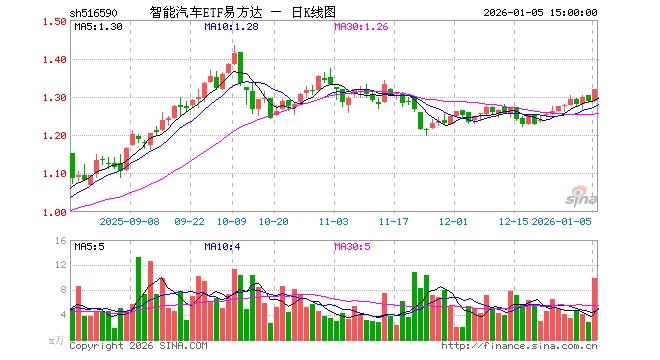 1月5日,智能汽车ETF易方达(516590)涨2.33%,成交额1315.91万元。当日份额减少300.00万份,最新份额为6701.50万份,近20个交易日份额减少700.00万份。最新资产净值计算值为8850.67万元。