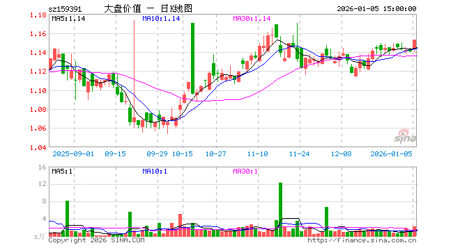 1月5日,大盘价值ETF(159391)涨1.14%,成交额253.32万元。当日份额减少100.00万份,最新份额为1.77亿份,近20个交易日份额减少6900.00万份。最新资产净值计算值为2.04亿元。