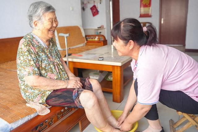 在惠民县,护理员刘洪香为90多岁的崔相荣老人提供居家上门服务