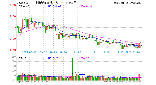 1月6日,创新药ETF易方达(516080)开盘涨0.15%,报0.683元。创新药ETF易方达(516080)重仓股方面,药明康德开盘涨0.59%,恒瑞医药涨0.44%,长春高新涨0.16%,科伦药业涨0.83%,复星医药涨0.07%,华东医药跌0.38%,百济神州涨0.04%,信立泰涨0.00%,康龙化成涨0.70%,泰格医药涨0.02%。