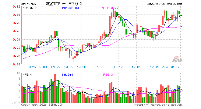 1月6日,旅游ETF(159766)开盘跌0.25%,报0.798元。旅游ETF(159766)重仓股方面,中国中免开盘跌0.35%,上海机场涨0.03%,中国东航跌1.16%,宋城演艺涨0.12%,南方航空跌0.87%,中国国航跌0.33%,华侨城A涨0.00%,锦江酒店跌0.04%,春秋航空跌0.35%,首旅酒店跌0.24%。