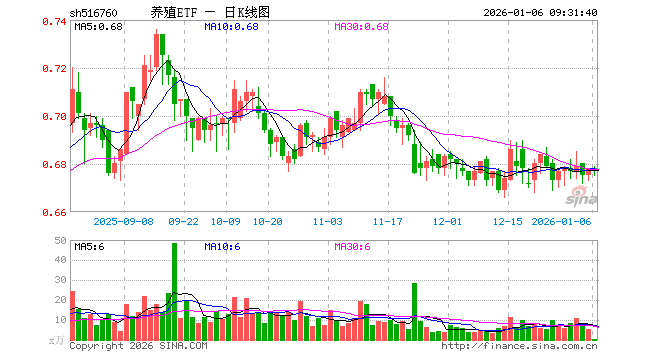 1月6日,养殖ETF(516760)开盘涨0.00%,报0.678元。养殖ETF(516760)重仓股方面,牧原股份开盘跌0.54%,温氏股份涨0.24%,海大集团跌0.18%,新希望涨0.00%,梅花生物涨0.00%,大北农跌0.25%,圣农发展涨0.06%,生物股份涨0.75%,天康生物涨0.00%,立华股份跌0.14%。