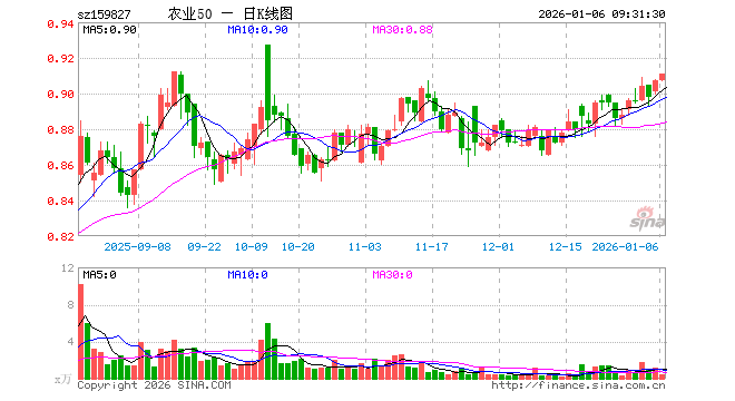 1月6日,农业50ETF(159827)开盘涨0.00%,报0.907元。农业50ETF(159827)重仓股方面,牧原股份开盘跌0.54%,温氏股份涨0.24%,海大集团跌0.18%,藏格矿业涨1.30%,盐湖股份涨3.29%,新希望涨0.00%,亚钾国际涨0.38%,梅花生物涨0.00%,扬农化工涨0.13%,大北农跌0.25%。