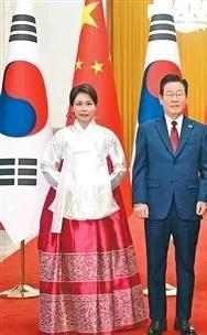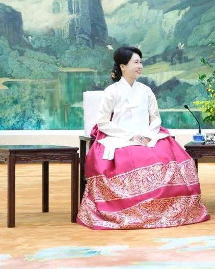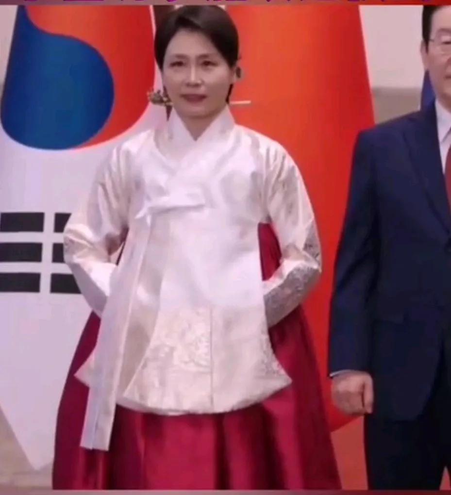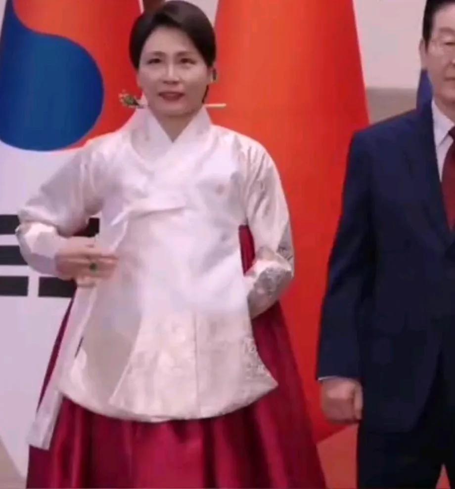 才知道,李在明访华最大的牌是老婆,金惠景,举手投足真给他长脸啊! 昨日,金惠景一席艳丽的韩服登场,白色的上衣,大红绣花裙子,她仪态大方,款款走来,走到预定位置,低头认真整理裙摆和上衣,双手交插在白色上衣下面。 颜色又选对了,大红的色彩烘托了喜庆热烈的氛围,让人好感倍增。 金惠景低头的瞬间,发髻后面露出白玉发簪,不是珠光宝气,但高贵典雅的仪态真让人拍案叫绝。 有这样的夫人撑场子,啥事不成? 娶到一个旺夫的女人,事业成了一半。