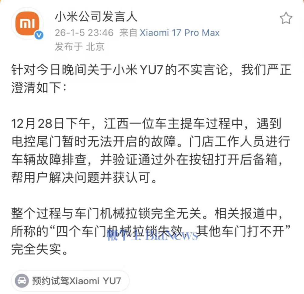 昨日晚间,小米公司发言人针对小米YU7相关言论进行澄清。