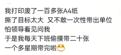 我打印废了一百多张A4纸,撕了目标太大,又不敢一次性带出,单位怕领导看见问我,于是我每天下班偷摸带二十张,一个多星期带完啦