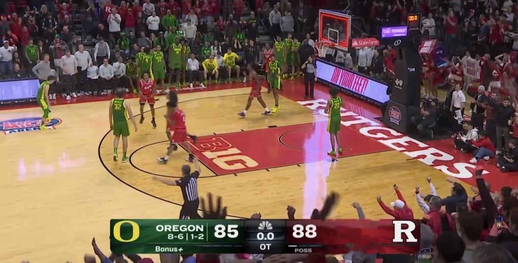 加时赛最后时刻,俄勒冈大学最后一球未能及时出手三分,惜败罗格斯大学。