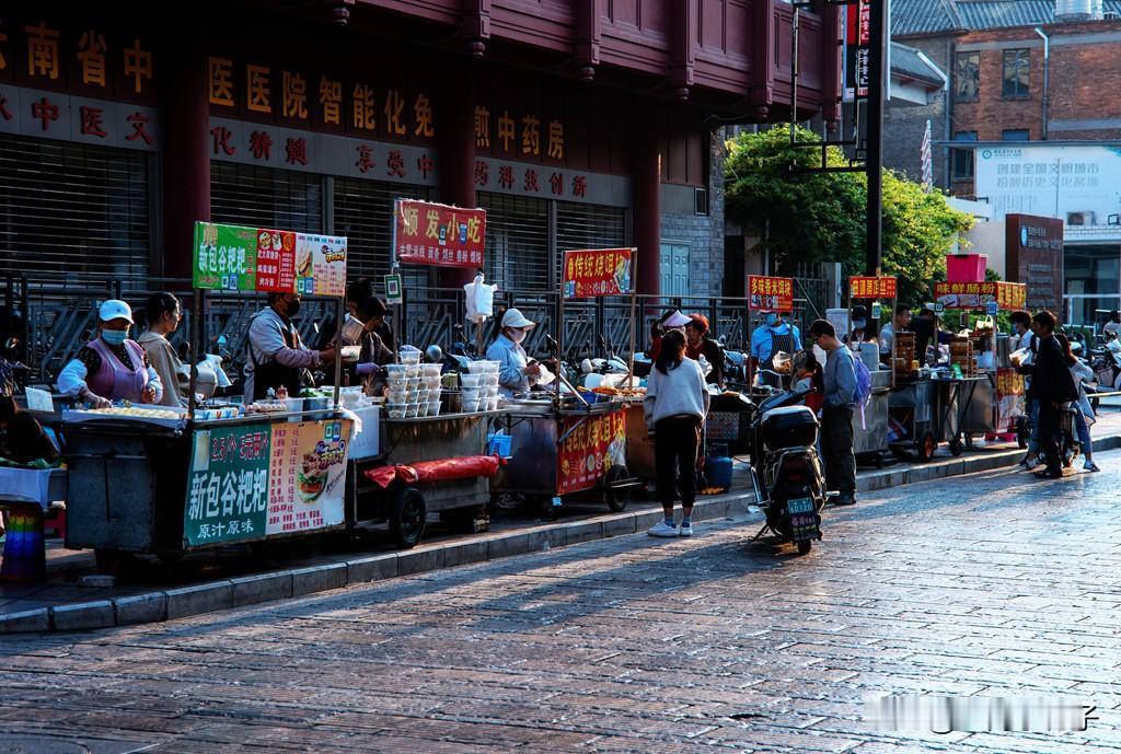 相距百年的早点摊。昆明光华街是昆明保存较好的一条老街,1929年,瑞士人阿诺尔德·海姆拍摄了当时光华街的早点摊。现在的光华街仍然保留着这一景象。云南