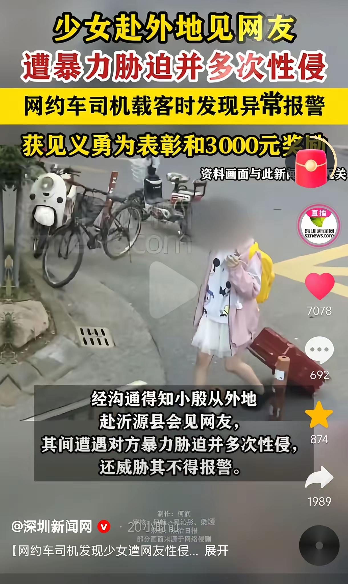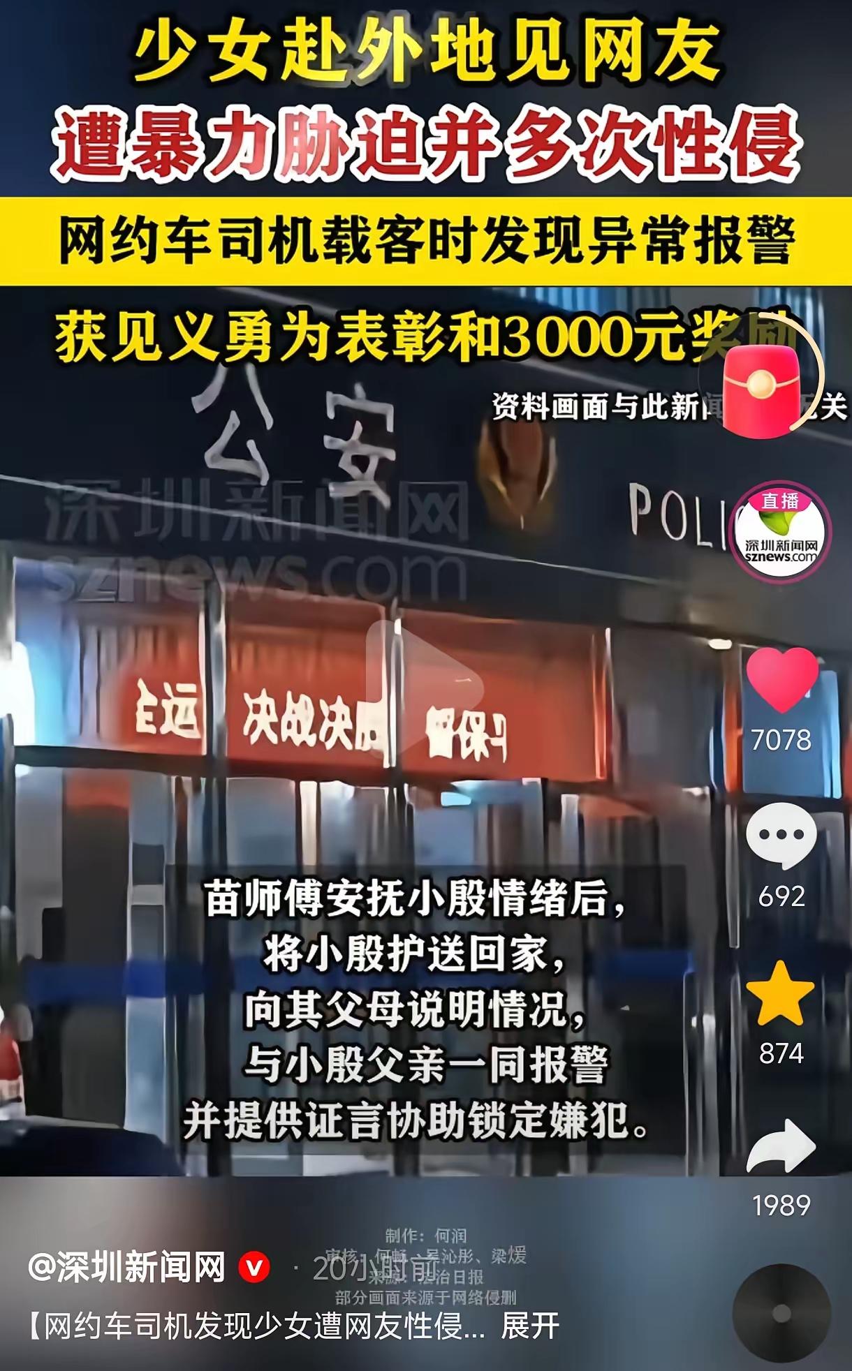 “警惕!”一名未成年女孩,瞒着父母跨省去见男网友,却被对方多次性侵。后来女孩逃出来坐上了网约车,司机见女孩神情慌张,便询问其缘由,女孩绷不住说了实情,司机听后义愤填膺,他安抚好女孩情绪后,一路将女孩护送回了家,并同女孩父亲一同报了警,最终嫌犯被锁定,等待他的将是法律的严惩,而司机也因见义勇为获得了荣誉表彰与3000元奖励。 女孩上车时浑身发抖,眼眶通红,手里紧紧攥着皱巴巴的衣角,连说话都带着哭腔。司机师傅没有多追问,只是递过去一瓶热水,轻声说别怕,有我在。 听女孩说完遭遇,司机气得直拍方向盘。他没有丝毫犹豫,当即调转车头,还特意绕开了偏僻小路,全程稳稳当当护着女孩往家赶。 女孩父母见到女儿时,当场红了眼眶,握着司机的手一个劲儿道谢。要不是这位热心肠的师傅,真不敢想孩子会遭遇什么更糟的事。 网上看到这事的人都拍手叫好,有人夸司机师傅是平民英雄,也有人提醒家里有娃的一定要多叮嘱,千万别让孩子轻信网友。 3000块钱的奖励不多,但这份见义勇为的勇气,比什么都珍贵。坏人被严惩,好人有好报,这才是最让人安心的结果。