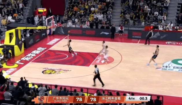 CBA常规赛,广东对阵浙江的比赛正在进行中。 第四节比赛中,浙江最后一攻跳投不中