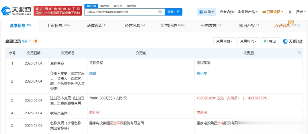 天眼查工商信息显示,近日,国家电投集团远达环保股份有限公司发生工商变更,企业名称变更为国家电投集团水电股份有限公司,陈斌卸任法定代表人、董事长,由姚小彦接任,注册资本由约7.8亿人民币增至约43.8亿人民币,增幅约461%,同时,多位主要人员发生变更。
