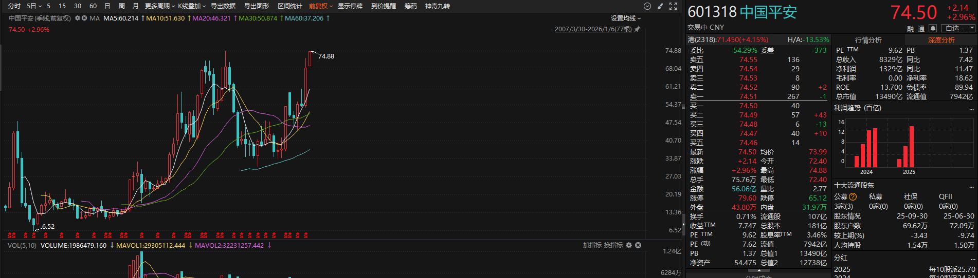 上证报中国证券网讯(记者何奎)1月6日,choice数据显示,中国平安A股盘中最高触及74.88元/股,创上市以来的新高。