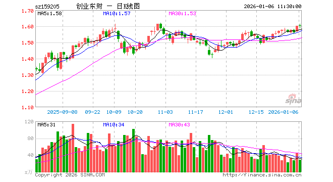 1月6日,截止午间收盘,创业板ETF东财(159205)跌0.06%,报1.602元,成交额4528.77万元。创业板ETF东财(159205)重仓股方面,宁德时代截止午盘跌1.84%,中际旭创跌3.53%,东方财富涨4.29%,新易盛跌2.91%,阳光电源涨0.42%,胜宏科技涨1.57%,汇川技术跌0.14%,迈瑞医疗涨1.47%,亿纬锂能涨0.16%,温氏股份涨1.01%。