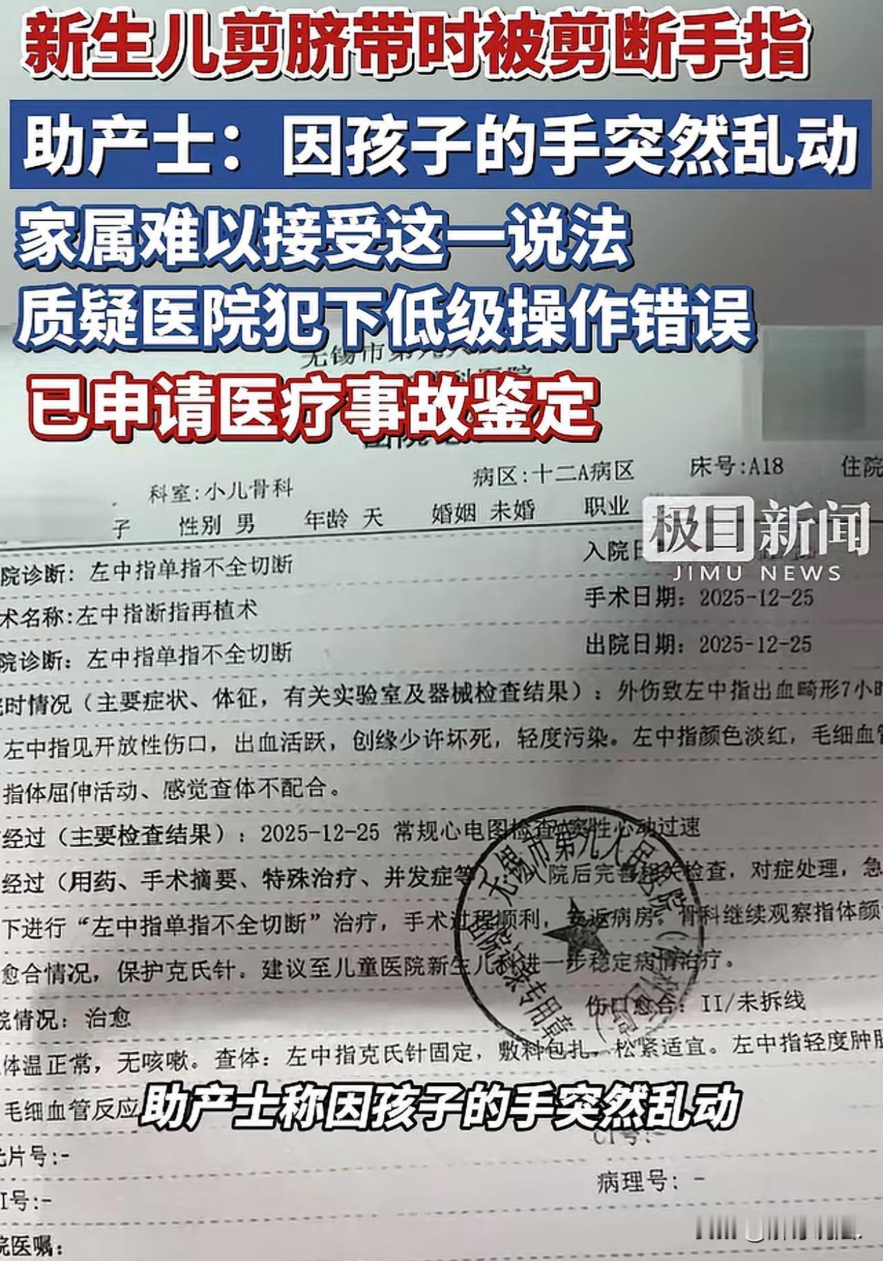 江苏盱眙,男子带着妻子在一家医院做剖宫产手术。没想到孩子出生后,助产士告知,在给孩子剪脐带的时候,把孩子的手指剪断了,并解释称,是孩子手突然乱动导致的。随后,医院将孩子送去别家医院,将孩子手指接好,并交了医药费。男子咽不下这口气,认为剪脐带是基础操作,不应该犯这么低级的错误。目前,男子已申请鉴定,准备走法律程序维权。涉事医院回应:谁也愿意发生这样的事,该承担的责任会承担。 2025年12月25日上午9点半,盛先生的妻子在盱眙县人民医院做剖宫产手术。 手术室外的盛先生心里又紧张又高兴,他等着孩子平安降生,盼着母子俩一起出来。 上午10点半左右,手术室里传来了婴儿的哭声,盛先生悬着的心一下子放了下来,脸上忍不住露出笑容,他知道孩子顺利出生了。 可这份喜悦没持续多久,就被一盆冷水浇灭了。 等到中午12点左右,一名医生从手术室里出来,脸上带着歉意,找到盛先生说了个让他浑身发懵的消息:助产士在给孩子剪脐带的时候,不小心用脐带剪把孩子的手指剪断了。 盛先生听到这话,脑子“嗡”的一声,半天没回过神来。 他反复追问医生是不是听错了,得到的却是肯定答复。事后,涉事助产士解释说,当时孩子的手突然乱动,才导致了意外发生。 这个说法让盛先生怎么也想不通,他实在没法接受:“这么大的一家医院,剪脐带是再基础不过的操作了,怎么会犯这么低级的错误? 就算孩子乱动,专业的助产士难道就没有一点防备吗?”一想到刚出生的孩子就要遭这份罪,盛先生的心里就像被针扎一样疼。 事发当天,医院不敢耽搁,赶紧安排救护车送孩子转院治疗。 因为断指再植对医疗技术要求高,孩子先后转了两次院,最后被送到了无锡市第九人民医院。 到了医院之后,孩子很快就被推进手术室,做了左中指断指再植术。 盛先生和家人守在手术室外,一步都不敢离开,心里一遍遍祈祷手术能成功。 好在手术很顺利,无锡市第九人民医院的出院记录上写得明明白白,孩子入院时诊断为“左中指单指不全切断”,经过治疗之后已经治愈。看到这份出院记录,盛先生悬着的心总算是稍稍放下了一些。 针对这件事,涉事的盱眙县人民医院也给出了回应。医院表示,现在正在全力配合孩子的后续治疗,孩子术后恢复情况良好。 院方的人说:“谁都不愿意发生这种事。事情出了之后,我们第一时间就用救护车把孩子送到省内最好的医院去救治,前期治疗的所有费用,也都是医院承担的。” 至于后续的康复和赔偿问题,医院称会和盛先生一家好好沟通,不过得等孩子再康复一段时间,才能坐下来具体谈。 可盛先生并没有等着医院主动协商,他觉得孩子受的罪不能就这么算了。 为了给孩子讨一个公道,为了弄清楚这件事到底是谁的责任,盛先生已经把相关的病历资料和证据整理好,提交给了当地的卫健委,申请做医疗事故鉴定。 盛先生说,他不在乎最后能拿到多少赔偿,就想知道这么低级的医疗失误,到底是怎么发生的。 他是孩子的父亲,必须站出来为孩子争取应有的权益,也希望医院能从这件事里吸取教训,以后别再让类似的意外发生在其他孩子身上。 网友炸了:孩子手乱动,不是你医生推责的理由,刚出世就遇上了特不负责的庸医。 孩子太无辜了,不会说话被说乱动、再怎么乱动也不至于快到那个程度,强词夺理的成分更多,人命关天的事情本大意不得。 《医师法》第37条规定,医师在执业活动中违反技术操作规范造成严重后果的,会被给予警告、暂停执业甚至吊销证书的处罚,构成犯罪的还会被追究刑事责任。 剪脐带是产科基础操作,有明确的技术规范,助产士作为专业人员,理应预判新生儿可能的肢体活动并做好防护,“孩子乱动”不能成为违反操作规范的借口。 最高人民法院关于审理医疗损害责任纠纷案件适用法律若干问题的解释第4条明确,患者主张医疗机构赔偿的,提交就诊和受损证据即可,医疗机构需自行证明无过错或损害与诊疗无关。 盛先生已提交医疗事故鉴定申请,后续若鉴定确认医院存在过错,医院需承担相应的赔偿责任。