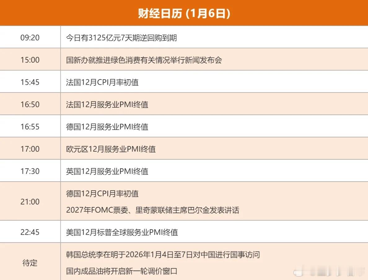 1.6股市早知道:1、外盘汇总:普涨,道指历史新高,如图一。 2、交易提示:如图二。 3、财经日历:如图三。 4、三大指数:1)大盘:继续看涨2)创指:新目标34703)科创50:先看1500,再看1588 5、重要新闻:1)证监会:进一步增强行政、刑事、民事协同,对财务造假和第三方配合造假一体打击;2)国务院国资委:聚焦生物育种、农机装备、农药化肥、粮食增产等领域,加强农业关键核心技术攻关和科技成果高效转化应用。 6、市场动态:1)四川印发《四川省国家数字经济创新发展试验区建设方案》;2)700亿元重点项目集中签约,上海浦东十大硬核产业集群目标出炉;3)高盛报告:建议高配中国股票,预计2026年和2027年中国股市将每年上涨15%至20%。 7、公司公告:1)惠而浦:2025年净利同比预增150%左右;2)胜通能源:七腾机器人已将要约收购保证金1.12亿元存入指定账户;3)盈方微:筹划重大资产重组事项,股票停牌;4)登云股份:涉嫌非法吸收公众存款罪;5)天赐材料:拟下调电解液改扩建项目产能至25万吨;6)威高血净:拟收购威高普瑞100%股权,交易价格为85.11亿元;7)中材科技:2025年净利同比预增74%-119%。(关注点赞+评论,陪你一起到牛市)财经今日A股优质财经分享
