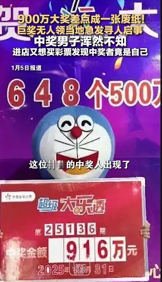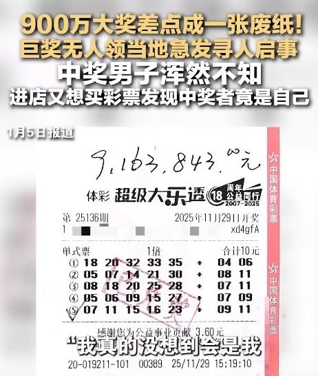 彩票界的“躺赢”天花板!900万藏钱包里一个月! 云南临沧这事儿,把网友看傻了!2025年11月末,体彩网点中了900万大奖,得主却迟迟不现身。体彩中心急得连发寻人启事,眼看60天兑奖期要到,这钱差点成废纸。 没想到12月30日,李先生揣着钱包进店买彩票,老板随口说:“咱这儿上个月中了900万,还没人领呢!”他心里一动,掏出钱包里那张躺了一个多月的彩票核对,数字一个不差! 李先生手都抖了,赶紧打电话叫爱人来:“你快来看!中奖的是我!”原来他买完就塞钱包,早忘了这茬,愣是让900万在兜里“睡”了一个多月。 网友笑称:“这心也太大了!换我得天天揣怀里数!”看来好运来了挡不住,但兑奖得抓紧,不然再大的奖也怕“过期不候”啊。 你买过彩票吗?有过这种“后知后觉”的惊喜吗?来评论区聊聊,为这位幸运儿点赞转发,沾沾喜气。
