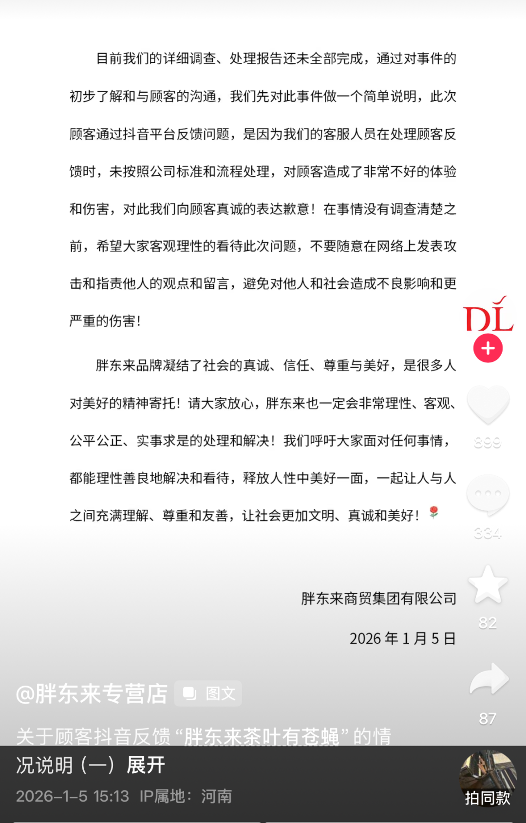 针对有消费者反馈“胖东来茶叶有苍蝇”一事,昨日下午,胖东来发布情况说明称,公司非常重视,立即组建以集团轮值组成的专项调查小组,对此事件详情进行严格的调查落实。待调查清楚后,会将事件调查结果第一时间通过官方平台进行公示。