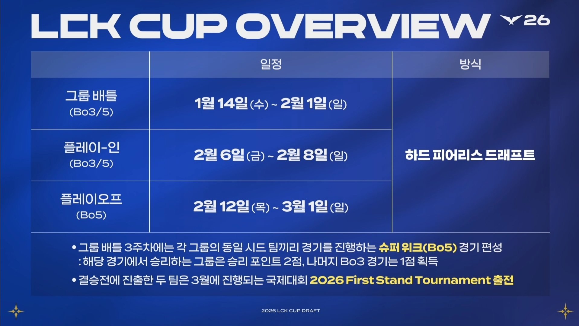 虎扑01月06日讯今日2026LCKCUP赛制已公布,相较于2025LCKCUP有所改动,具体如下: