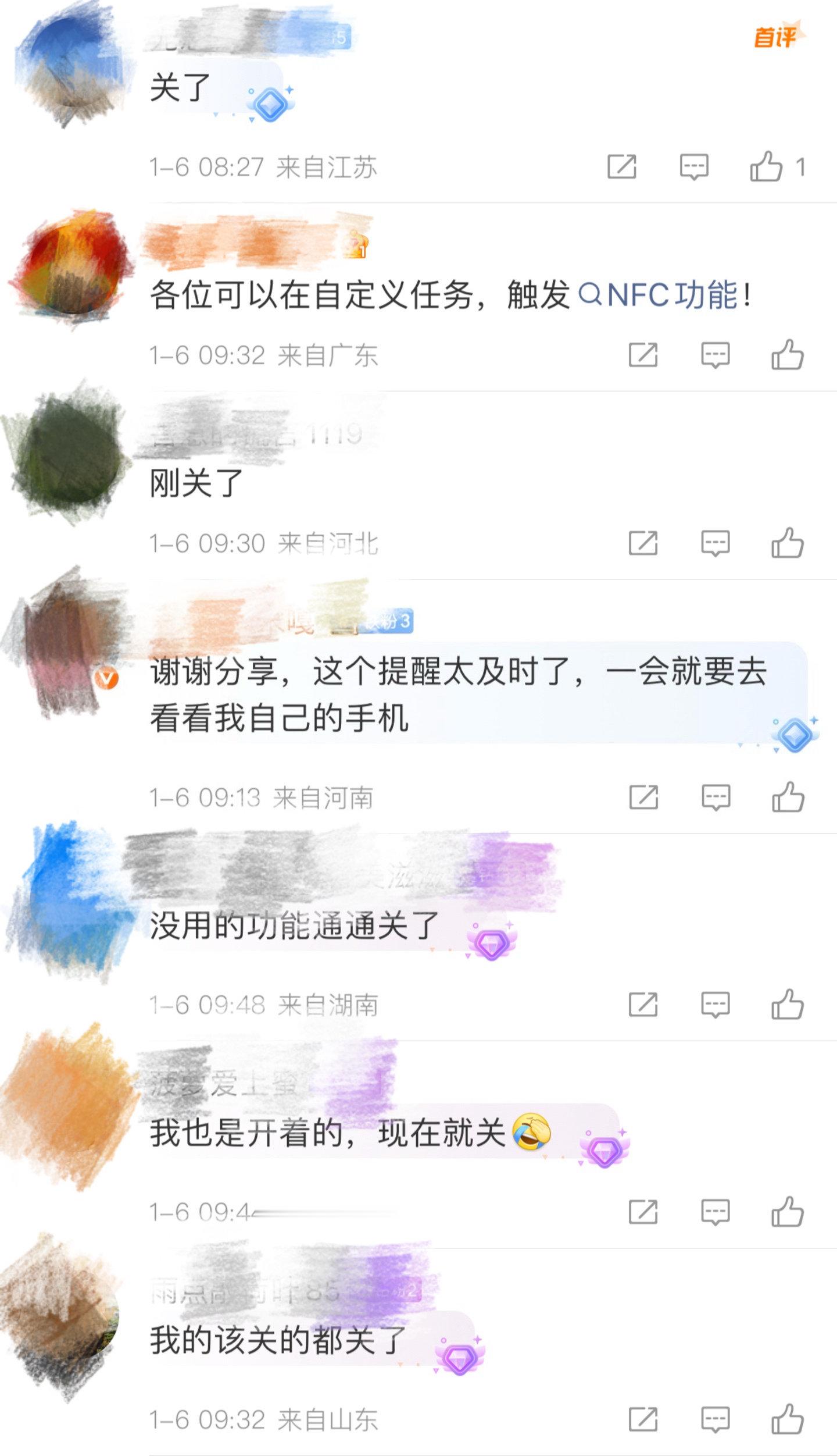 然而,当技术赋予生活便捷的同时,也悄然打开了风险之门。多地出现利用NFC功能实施诈骗的新型犯罪手法,不少用户在毫无防备的情况下,银行卡内资金被隔空盗刷,个人信息亦遭泄露。今天,“手机这个功能不用时要关闭”话题登上热搜,引发热议,不少网友表示“检查后才发现一直开着NFC”“刚关闭NFC”。