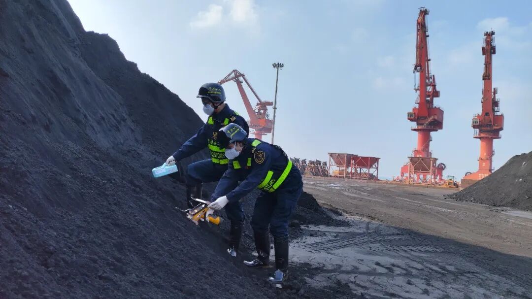阳江海关关员穿梭其中,紧锣密鼓地对铁矿堆开展现场检查,保障元旦期间首票进口货物高效有序验放。