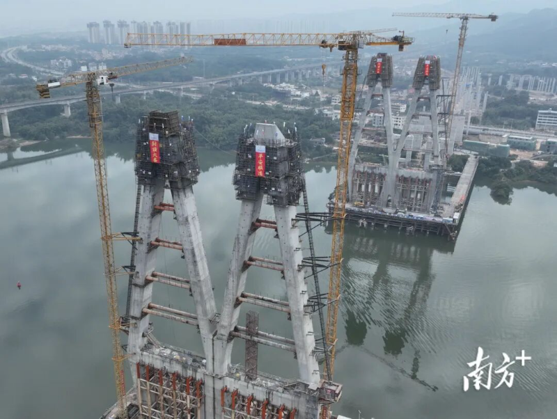 大桥创新的设计带来塔柱截面渐变、四索面锚固点密集等施工难题,项目通过搭建智能测量网络,实时监测塔柱偏位及应力变化,实现塔身线型顺直、内力均匀。项目建设者将塔柱划分为8个作业区,采用“跳仓法”施工与塔吊“错峰吊装”,避免了立体交叉作业风险,施工效率提升30%以上,实现安全与效率的双重飞跃。