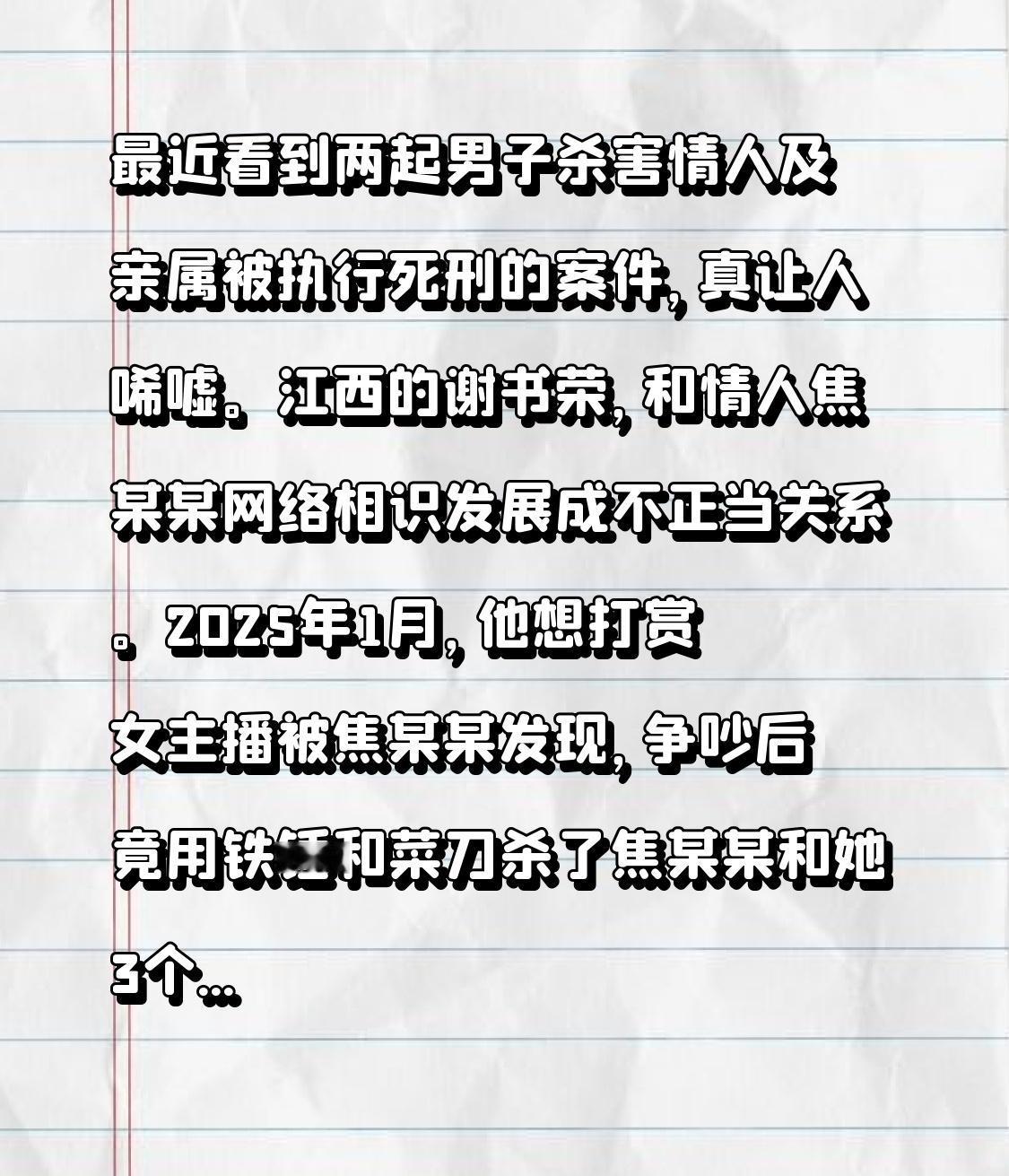 最近看到两起男子杀害情人及亲属被执行死刑的案件,真让人唏嘘。江西的谢书荣,和情人焦某某网络相识发展成不正当关系。2025年1月,他想打赏女主播被焦某某发现,争吵后竟用铁锤和菜刀杀了焦某某和她3个孩子,最终在2025年12月31日被执行死刑。 还有山东的徐某,和有夫之妇魏女士发展关系还生子。因感情纠纷和对方丈夫起诉等事,他先杀了魏女士6岁儿子,又杀了魏女士,2025年5月23日也被执行死刑。感情里有矛盾很正常,但用这么极端的方式解决,实在罪无可恕。