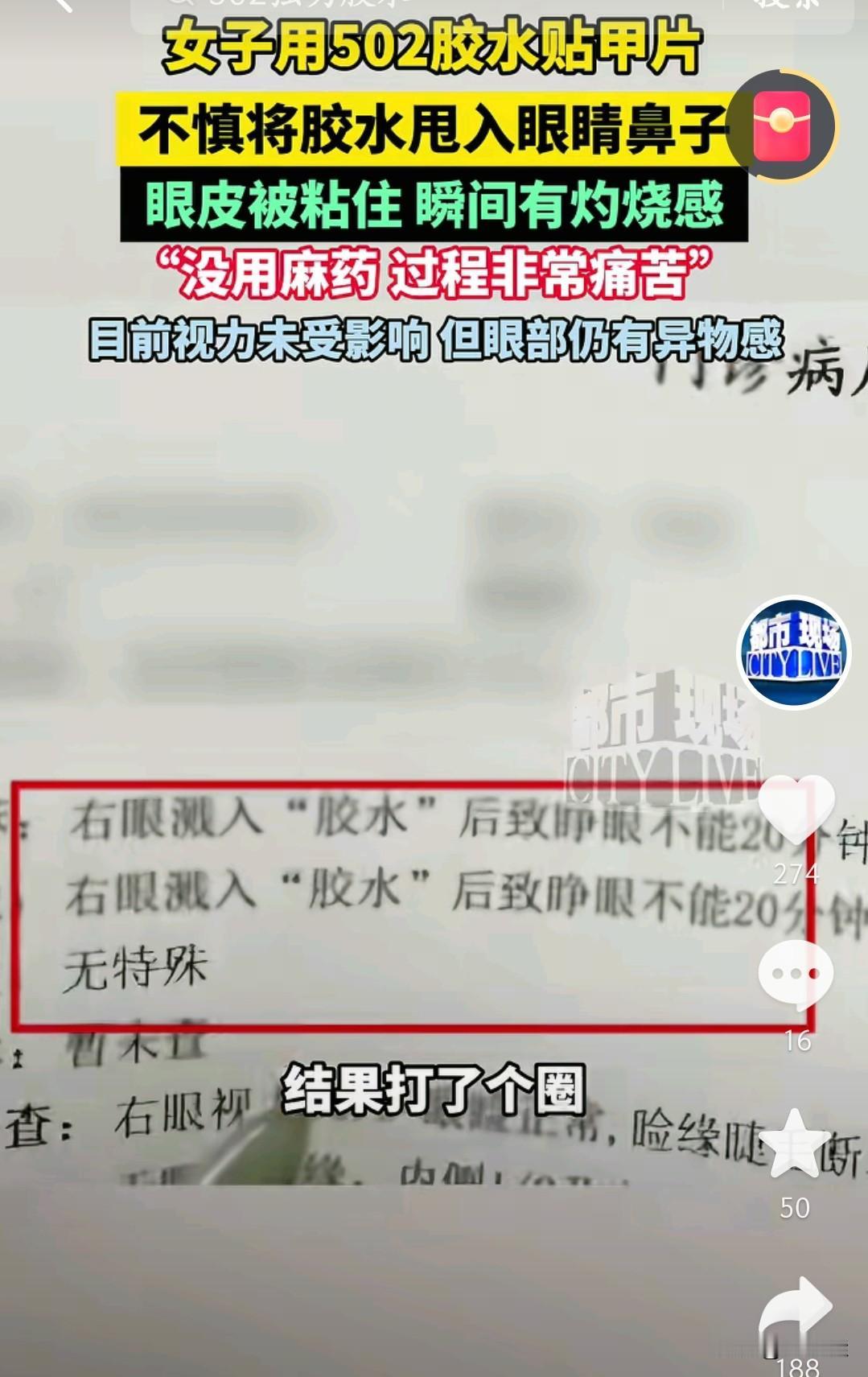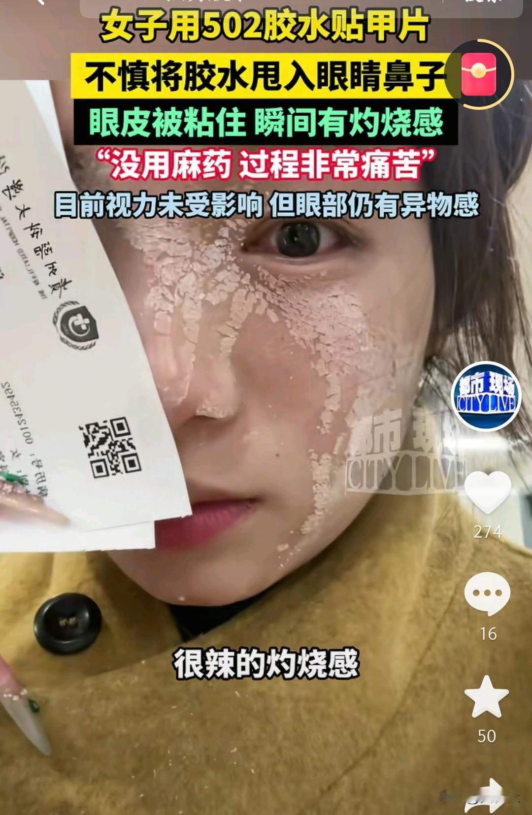 真是个人才,居然用502胶水贴甲片,结果把胶水甩进眼睛和鼻子里,眼皮都被粘住了,想想都觉得疼。 这位女士当时肯定慌坏了,胶水进眼瞬间就有灼烧感,去处理的时候还没打麻药,那滋味估计一辈子都忘不了。还好最后视力没受影响,只是眼睛还有点异物感,也算是不幸中的万幸了。 爱美没错,但真得注意方式方法啊。贴甲片有专门的美甲胶,非要用502这种强力胶,简直是拿自己的身体开玩笑。这件事也给大家提了个醒,不管做什么事,安全永远是第一位的,可别为了好看干出这种糊涂事。