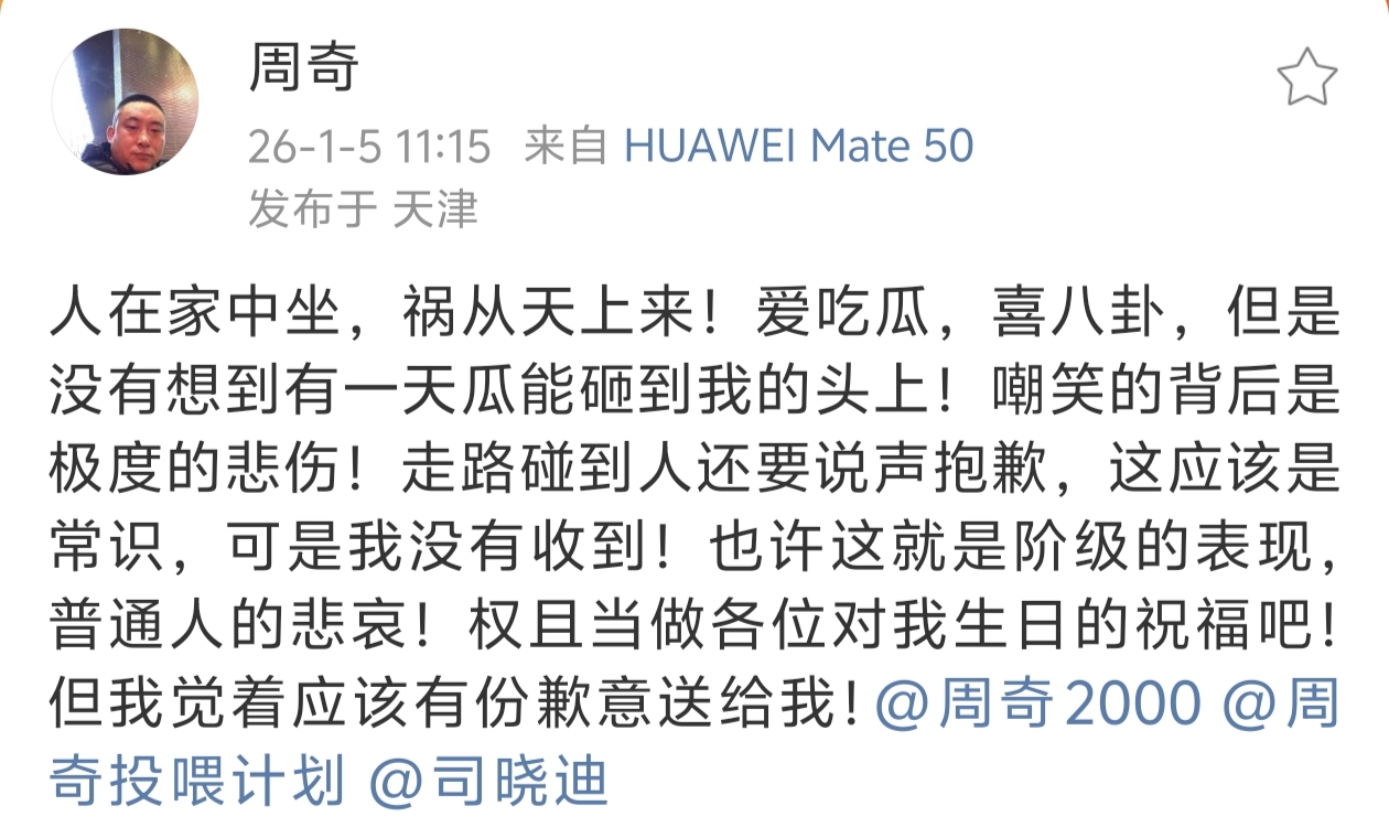 周奇称,希望事情的“源头”(引发此事的司晓迪——编者注)向他道歉,正在考虑是否走法律途径,“(我)不应该跪着承受这种事情。”