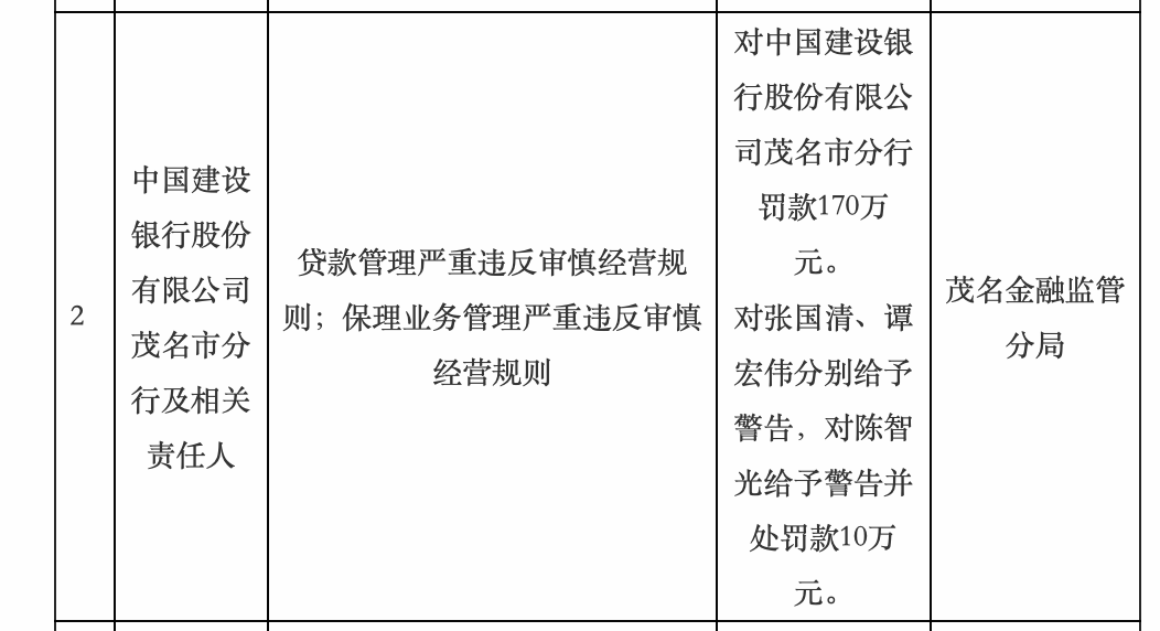 1月5日,国家金融监督管理总局茂名监管分局行政处罚信息公开表显示,建设银行茂名市分行,因贷款管理严重违反审慎经营规则;保理业务管理严重违反审慎经营规则,被罚款170万元。同时,对张国清、谭宏伟分别给予警告,对陈智光给予警告并处罚款10万元。