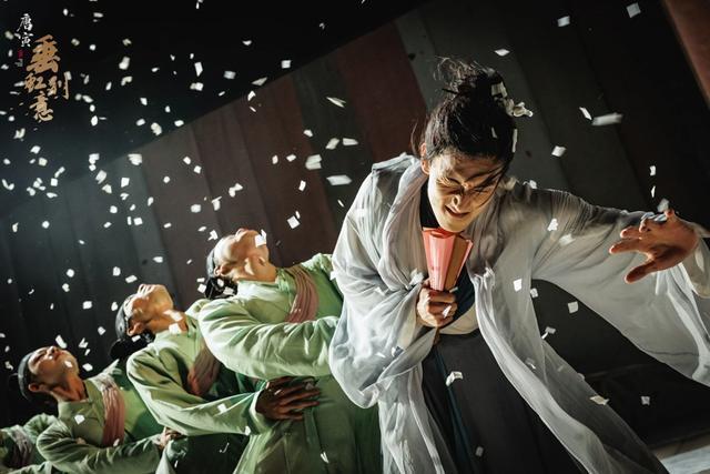 群舞的设计同样暗含深意。科场舞弊案中,身着官袍的舞者以僵硬的关节、机械的队列构成“体制之网”,而唐寅在其中以舒展的水袖突围,肢体语言的对抗性直指“个体与时代的冲突”。在僵化队列所象征的集体性幻灭之中,这位风流才子正是在理想的泡影与时代的幻灭中,淬炼并绽放出独一无二的自我。