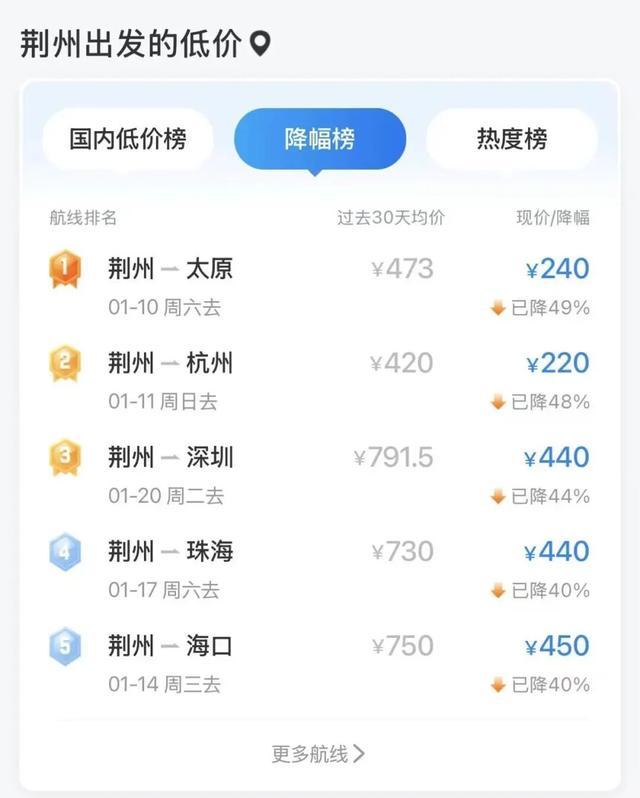 不少航班降幅均在40%及以上