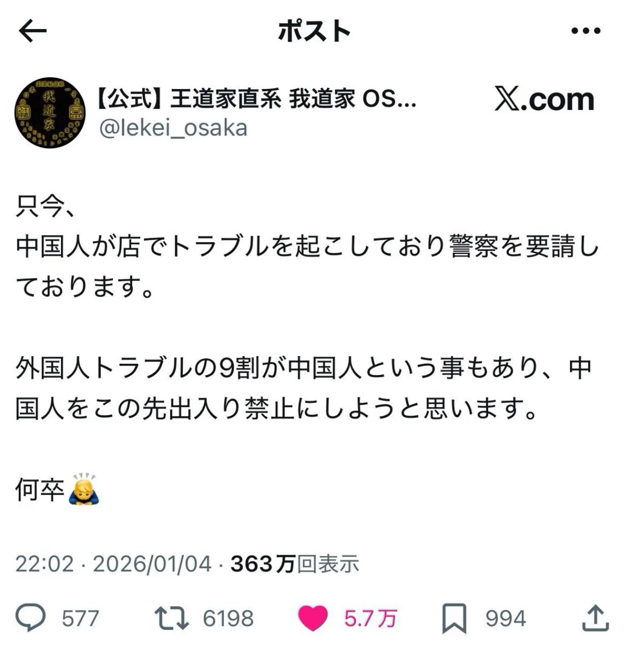 近日,日本大阪的一家拉面店,他们发帖说,店里的因外国人引发的麻烦,有9成是中国人造成的,现在他们打算今后禁止中国人入店! 而此前就有中国网友发帖避雷这家拉面店,因为这家店双重定价,针对日本顾客就收取原价,对外国顾客就收取双倍的费用,也应遭到中国网友的曝光惹恼了他们,现在准备开始针对中国人禁止入内了….