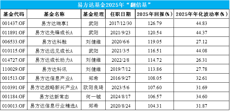 其中,擅长行业配置的武阳目前在管的3只基金年收益率在120%左右,均衡成长风格的刘健维也有3只在管产品年涨幅超110%;老将郑希深耕TMT领域,其管理的2只科技行业主题基金年收益均超100%;新人欧阳良琦、何一铖各有1只“翻倍基”。