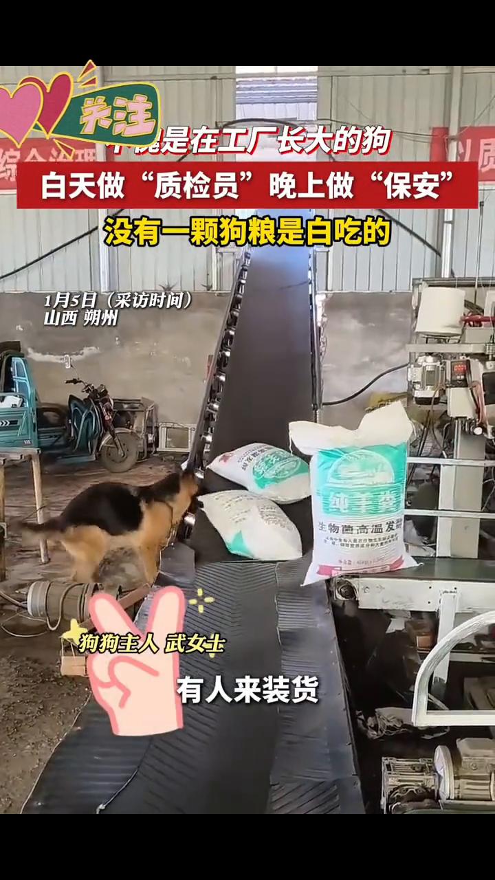 是在工厂长大的狗,白天做"质检员"晚上做"保安",没有一颗狗粮是白吃的。 狗狗主人武女士。 1月5日(采访时间),山西朔州。这是个在厂子里长大的狗,它每天都干活,训练过,它自己学会了。有人来装货,它就要过那去盯着,没事它就在那拉一下,到晚上的时候,它就会给厂子里看门,做保安。