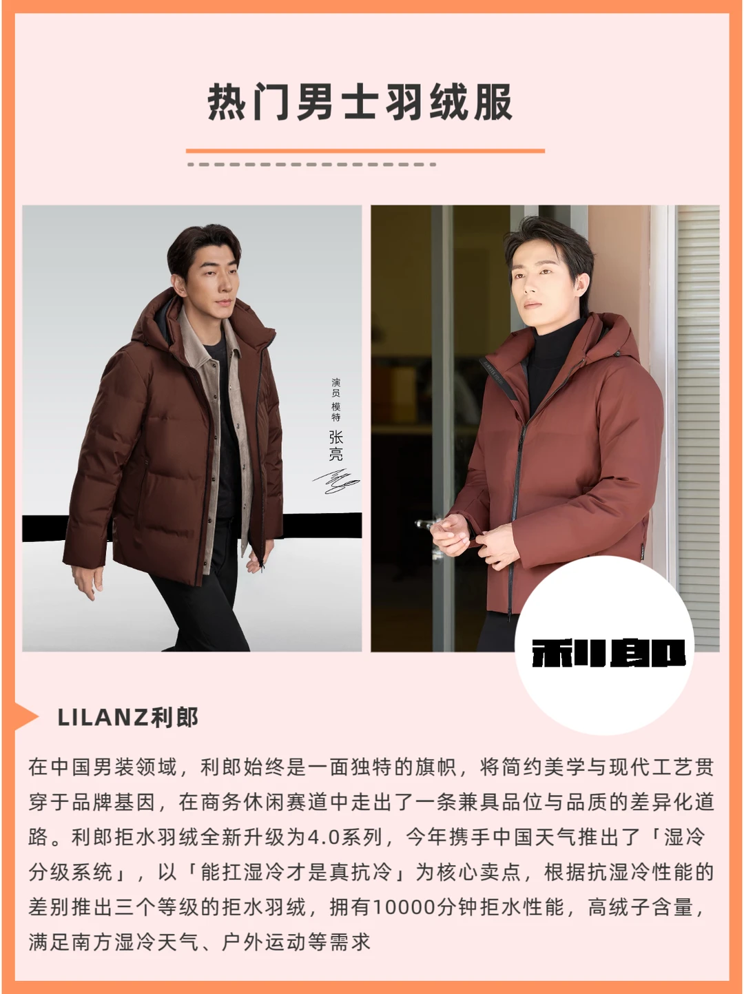 这个区间适合追求质感与实用并重的都市男性。例如利郎的羽绒服在版型和面料上注重通勤适配,利郎拒水羽绒系列应对南方的湿冷天气很实用,兼顾商务与日常场景