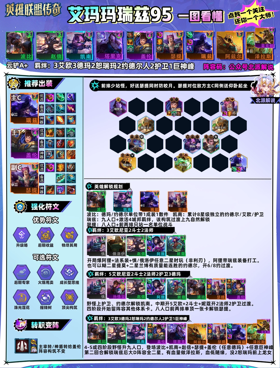 该构筑的瑞兹较强的是德玛的斩杀和恕瑞玛的控制+挖宝。