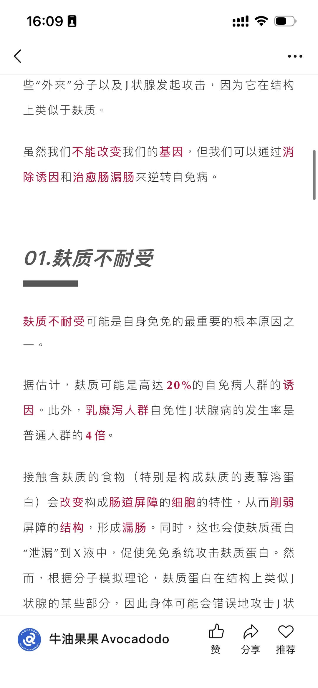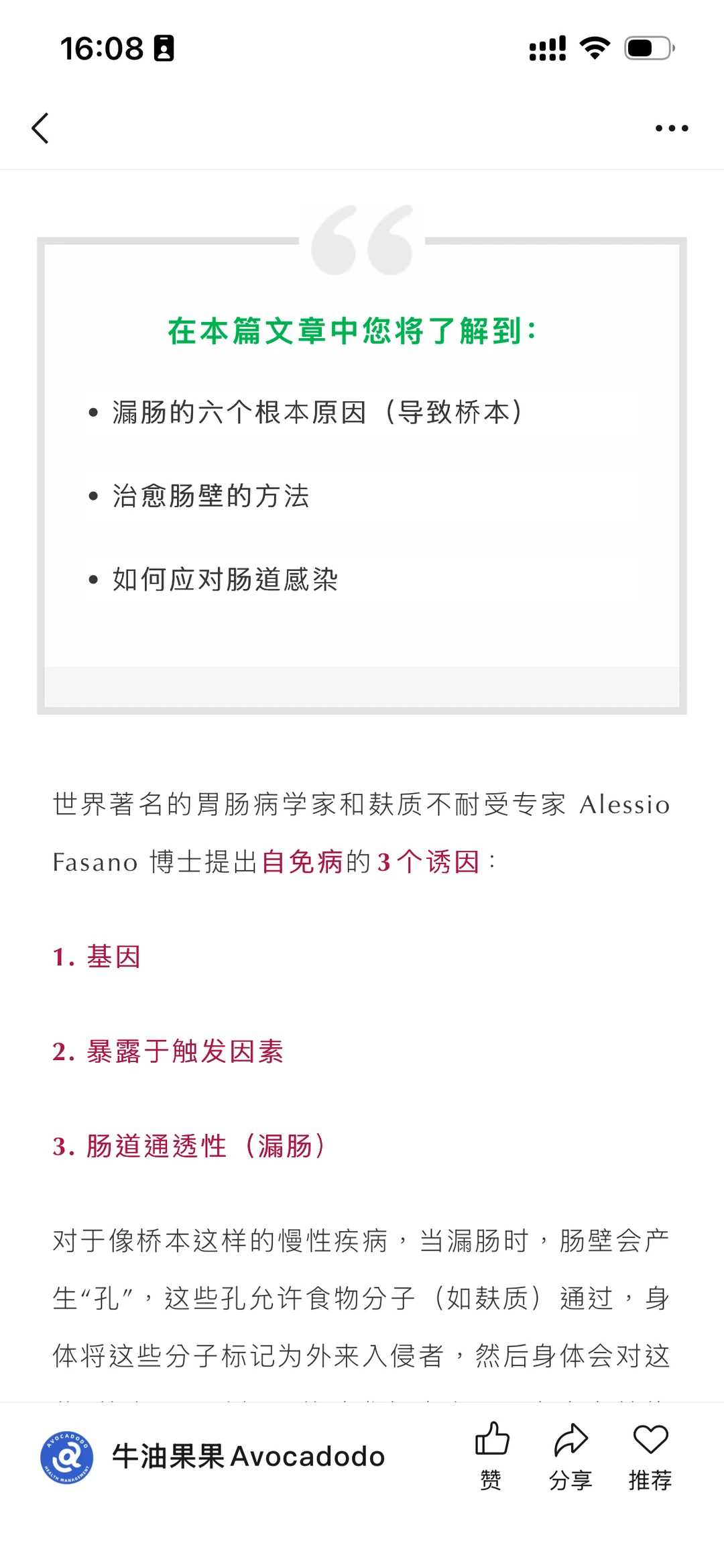 很多桥本姐妹在认真忌口很久之后,抗体还是居高不下。 虽然忌口很重要,但如果忌口3-6个月抗体水平或者表面Z状还是没有改变,那说明你需要迫切地解决「肠漏」问题了。 . 肠漏作为桥本的诱因之一,主要有这几种触发因素: [一R]麸质 [二R]食物不耐受 [三R]缺乏谷氨酰胺/锌 [四R]寄生虫 [五R]小肠细菌过度生长(SIBO) [六R]真菌 . 那要如何针对这些因素解决肠漏,修复我们的肠壁呢? 今天这篇博士文章中就给出了很多解决方案~