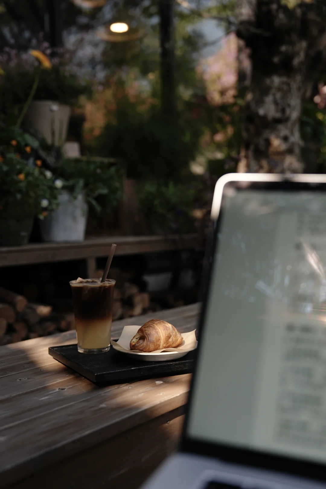 上午十点的花园,阳光正斜斜地穿过栏杆,在石板路上投下摇曳的叶影。我照例点了一杯苹果美式和肠仔包,坐在视野最好的位置,打开电脑开始准备下午面试的内容。键盘声很轻,思绪却清晰。