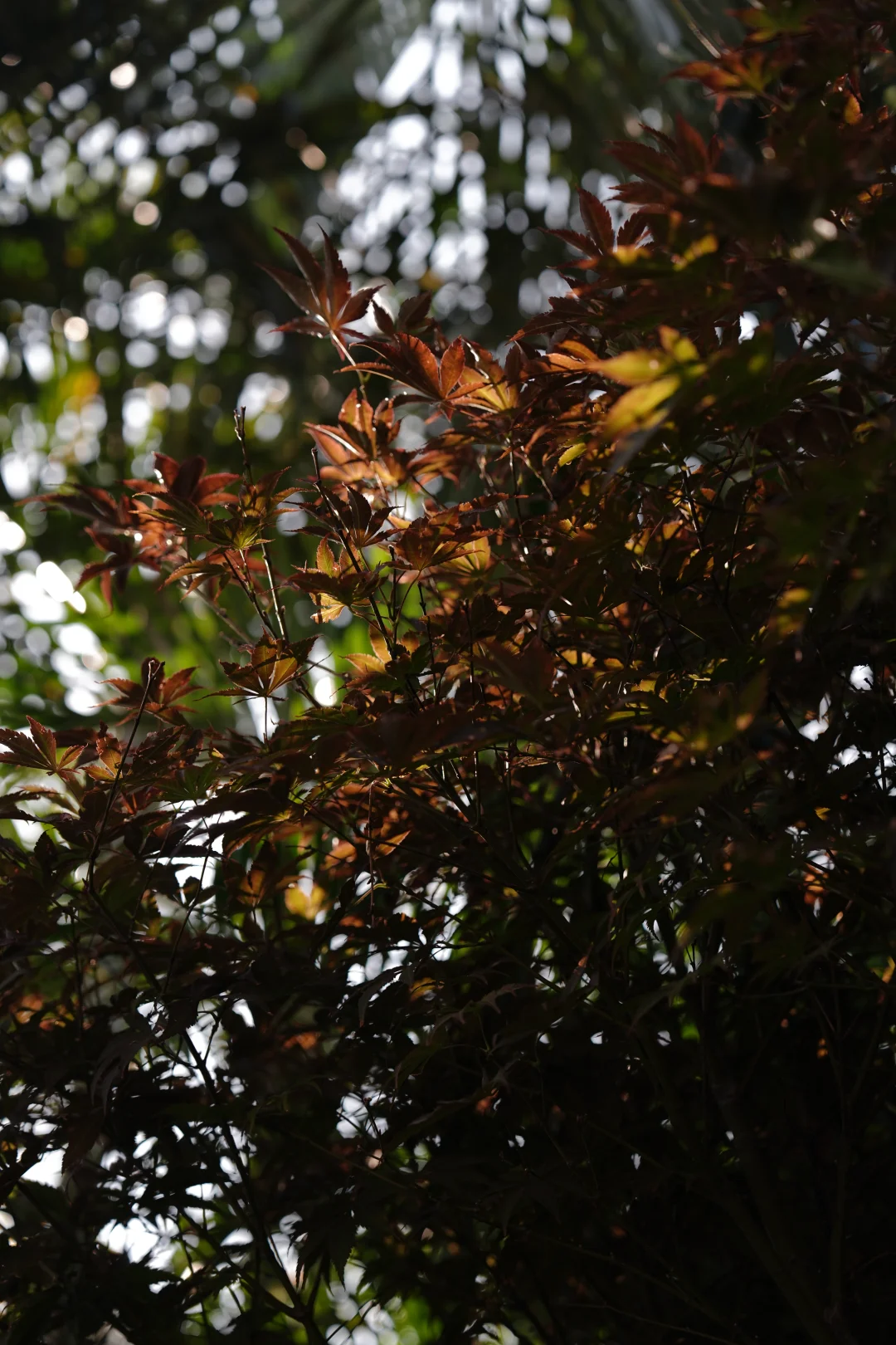 猫在花架下凝神不动,盯着花瓣上停驻的蝴蝶,尾巴尖微微颤动。枫树的叶子被照得透亮,橙红色的光斑落在桌角,像秋天留下的温柔印记。脚边的狗睡得正熟,呼吸均匀起伏,仿佛梦里也在奔跑。