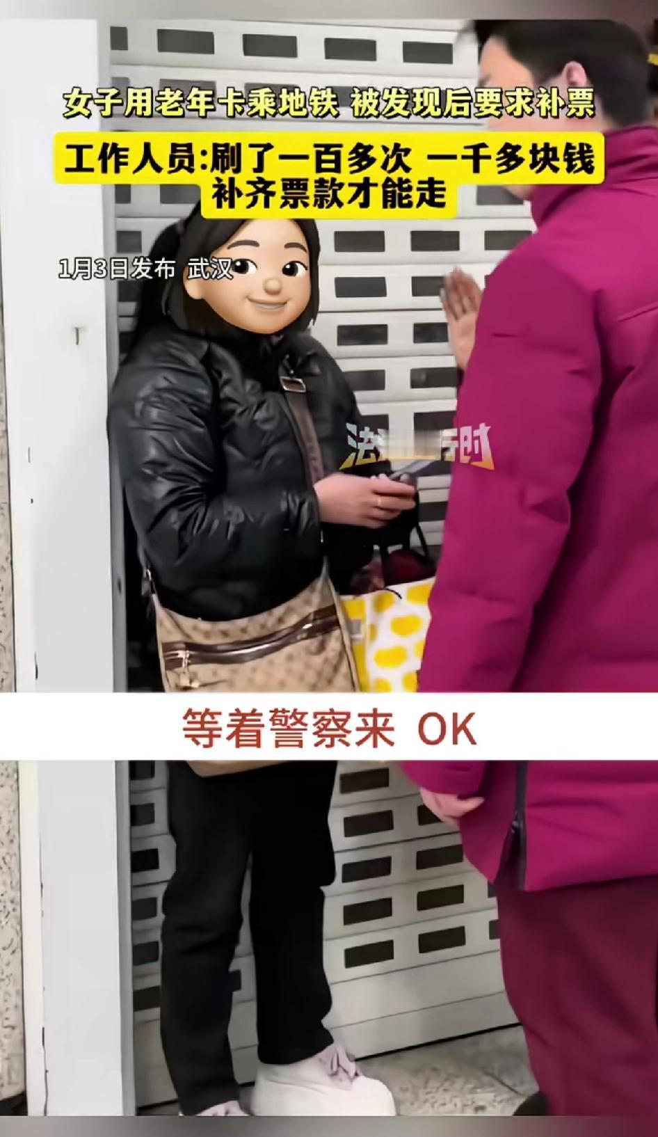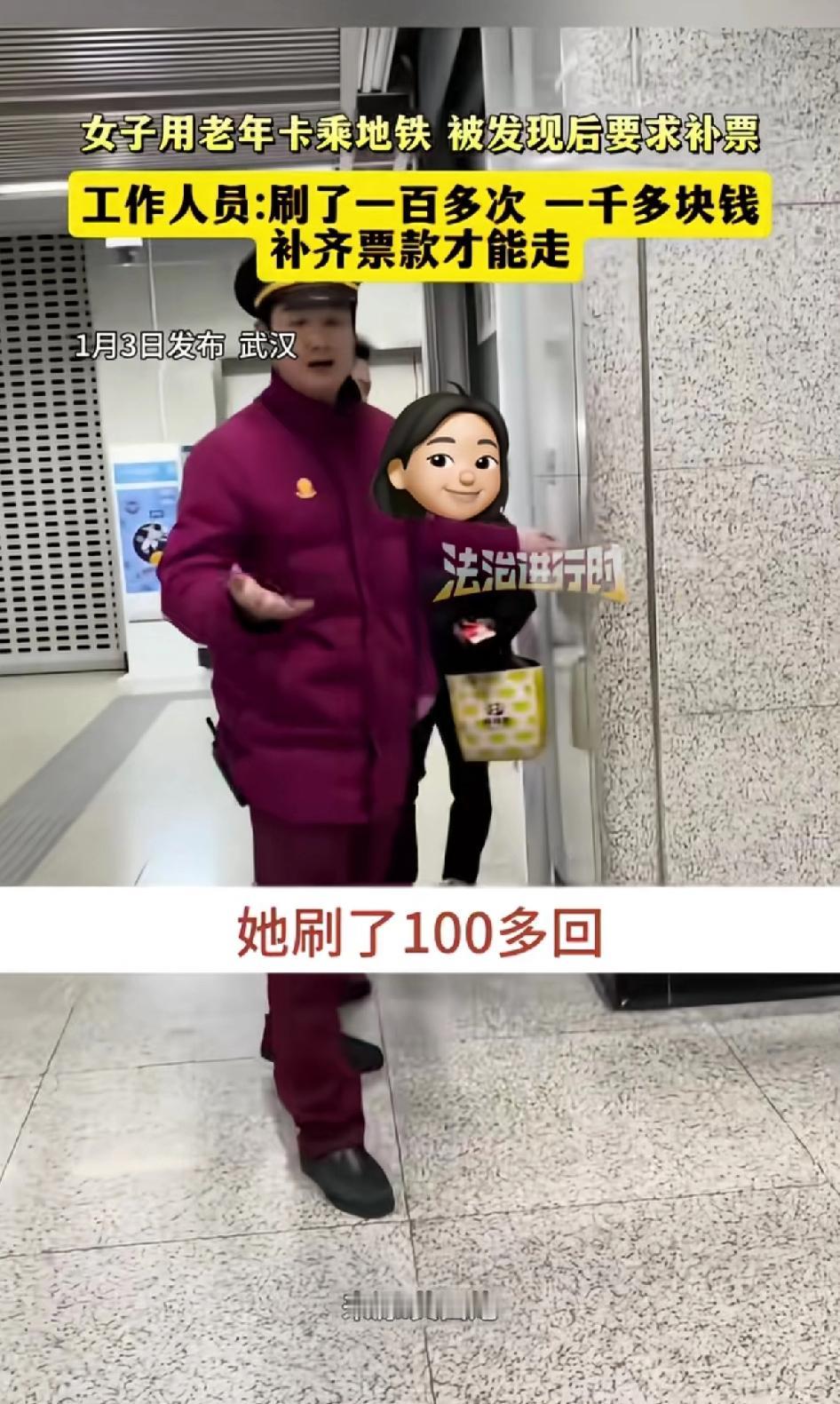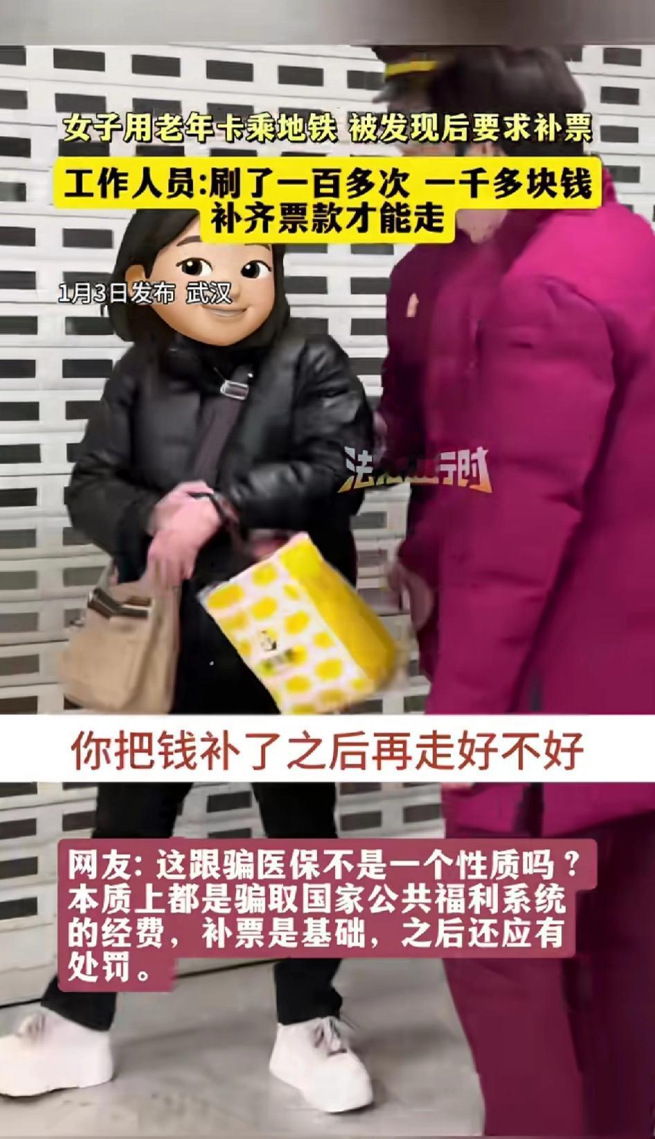 女子用老年卡乘地铁,被发现后要求补票。工作人员:刷了100多次 一千多块钱,补齐票款才能走。 1月3日,武汉地铁站发生了一件令人无语的事。一名三十来岁黑衣挎包、戴着金镯子的女子,被工作人员拦下,原因是她冒用老年卡坐地铁超100次,累计少交1000多元。 工作人员要求女子补齐票款再走,可她左躲右闪还试图硬闯闸机。路过的陌生人看到都忍不住吐槽:坐地铁都不愿付钱,还能付啥?期间女子就是不愿意补交票钱,还多次试图逃走。工作人员无奈告知女子如果不补交票钱,他们只能选择报警,让帽子叔叔来解决这件事。 看女子衣着体面,也不像吃不起饭,落魄的连地铁票都付不起的样子,面对工作人员的催促还再三躲闪。 政府给60岁以上的老年人免票,是照顾到老年人上了年纪,有些身体不好的已经丧失劳动力,所以才多加照顾,给老年人免票。 图片上的女子看穿着明显是个年轻人,真是年纪轻轻不学好,净想着走捷径。 女子冒用他人乘车证件,除补票外还可能面临罚款,情节严重甚至会触犯法律。去年8月武汉也有类似事件,一位59岁女子用母亲老年卡乘车被查,补交约50元。 坐一次公交车,或地铁能花几个钱,还要违背公共道德,冒充老人来逃票,真活不起了。 占小便宜耗的是公德,遵守规则才是真体面。