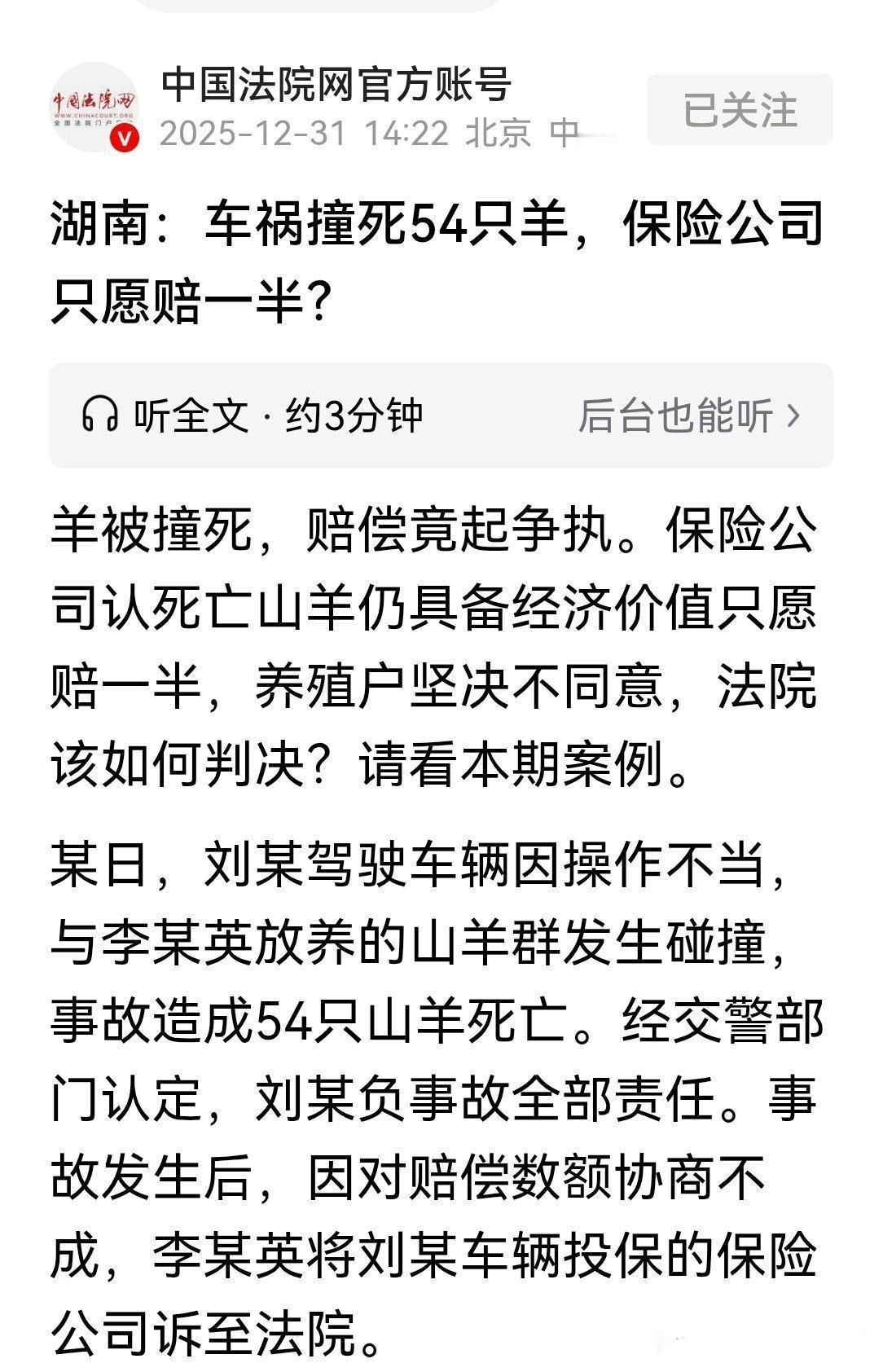 离谱!轿车失控撞死54只羊,定损9.9万保险公司只赔一半,法院判决太解气 湖南湘潭这事儿,看完真的气到肝疼! 司机刘某开车走神,车辆失控冲进路边羊群,当场撞死54只山羊,现场惨不忍睹。放羊的李英差点吓晕过去——这群羊可是她家的全部家当,老老小小的吃穿用度全靠它! 交警认定刘某全责,保险公司定损后,确认54只羊损失99290元,李英对此没有异议。 本以为这事儿就该按定损金额赔偿,谁知道保险公司竟出了个奇葩操作:他们说羊虽然死了,但羊肉、羊皮、羊骨头都能卖钱,还有经济价值,所以只愿意赔偿一半的钱! 更可气的是,他们还让李英自己把死羊拉回去处理卖钱,美名其曰“增加收入”。 李英当场就炸了:这是什么歪理!我可以不要这些死羊,你们保险公司拉走做无害化处理都行,凭啥扣我一半赔偿款? 双方协商多次,保险公司咬死只赔一半,李英一气之下把保险公司告上了法庭。 法庭上,保险公司振振有词,坚称死羊有残值,理应扣减赔偿。 但法院的判决直接打脸,亮点十足: 第一,谁主张谁举证,保险公司拿不出证据证明李英处理了死羊并获得收益,扣钱说法根本站不住脚; 第二,根据相关规定,交通事故致死的畜禽必须无害化处理,严禁买卖,保险公司所谓的“经济价值”压根不成立! 最终法院一审判决保险公司全额赔偿99290元,保险公司不服上诉,二审直接驳回,维持原判! 这波判决真是大快人心!明明是车主全责,保险公司却想耍小聪明克扣赔偿,幸好法律给了无辜的养殖户一个公道!