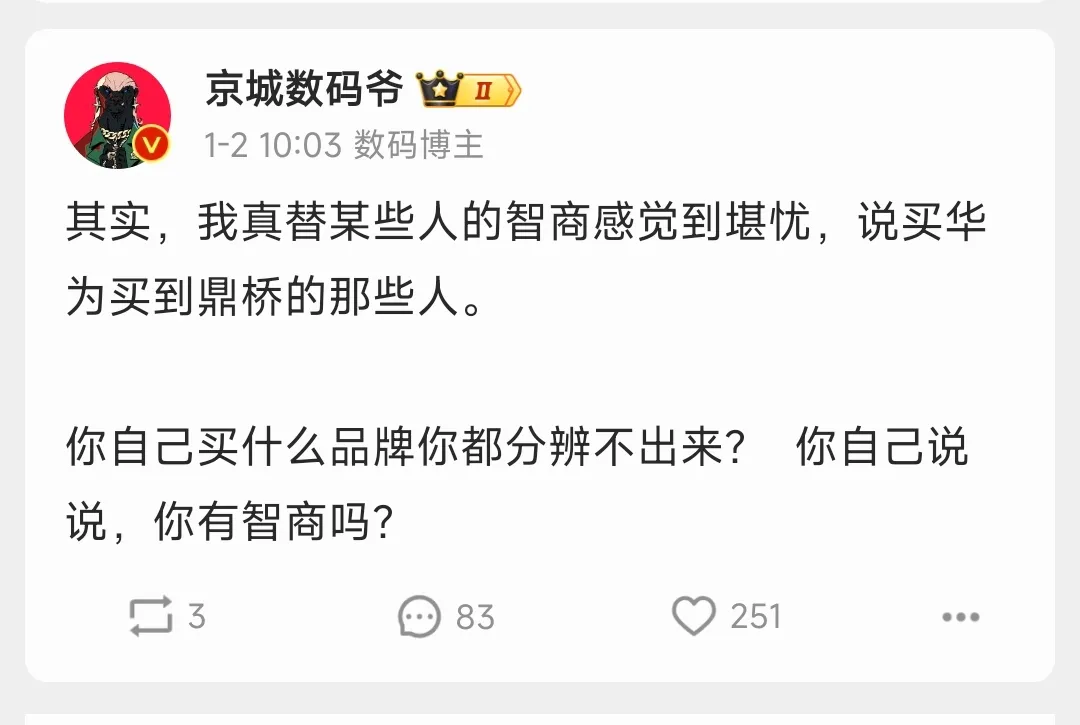 比如这种“xx数码爷”,发表这种“分不清鼎桥手机的用户,本身智商有问题”言论,真的是在维护花厂吗?